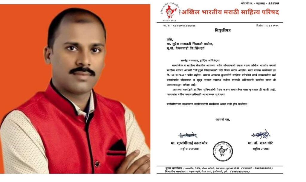 मुंबई (पी.डी. पाटील)- मराठी साहित्य क्षेत्रातील अग्रणी असलेल्या अखिल भारतीय मराठी साहित्य परिषदेच्या सिंधुदुर्ग जिल्हाध्यक्षपदी सुप्रसिद्ध साहित्यिक डॉ सुरेश भिवाजी पाटील यांची निवड करण्यात आली आहे, साहित्य परिषदेचे राष्ट्रीय अध्यक्ष डॉ. शरद गोरे यांनी नुकतेच त्यांना निवडीचे पत्र दिले.
