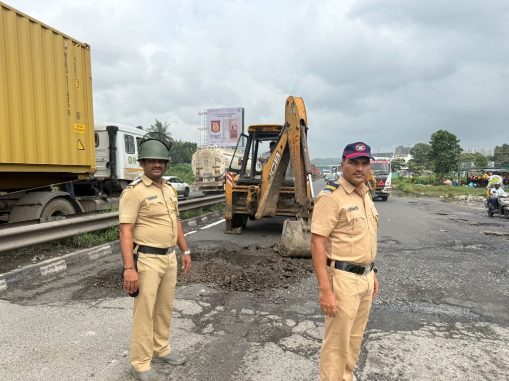 सध्याच्या सणासुदीच्या दिवसांमुळे पनवेल शहर पोलीस ठाण्यातील पोलिसांची विविध पथके हे पळस्पे फाटा राहूल हॉटेल परिसर त्याचप्रमाणे मुंबई-पुणे महामार्गावर कर्तव्य बजाविण्यासाठी कार्यरत आहेत. यावेळी त्यांना रस्त्यावर पडलेल्या खड्ड्यामुळे वाहतूक कोंडी होत असल्याचे लक्षात आले. या संदर्भात त्यांनी वपोनि नितीन ठाकरे यांच्या मार्गदर्शनाखाली स्वतः रस्त्यावर उतरुन हे खड्डे बुजवून घेण्यास सुरूवात केली. त्याचा फायदा येथून ये-जा करणार्यांना वाहन मालकांना झाला व मोठ्या प्रमाणात होणारी वाहतूक कोंडी ही आता सुरळीत होताना दिसत आहे. याबद्दल चाकरमान्यांनी पनवेल शहर पोलिसांचे आभार मानले आहेत.