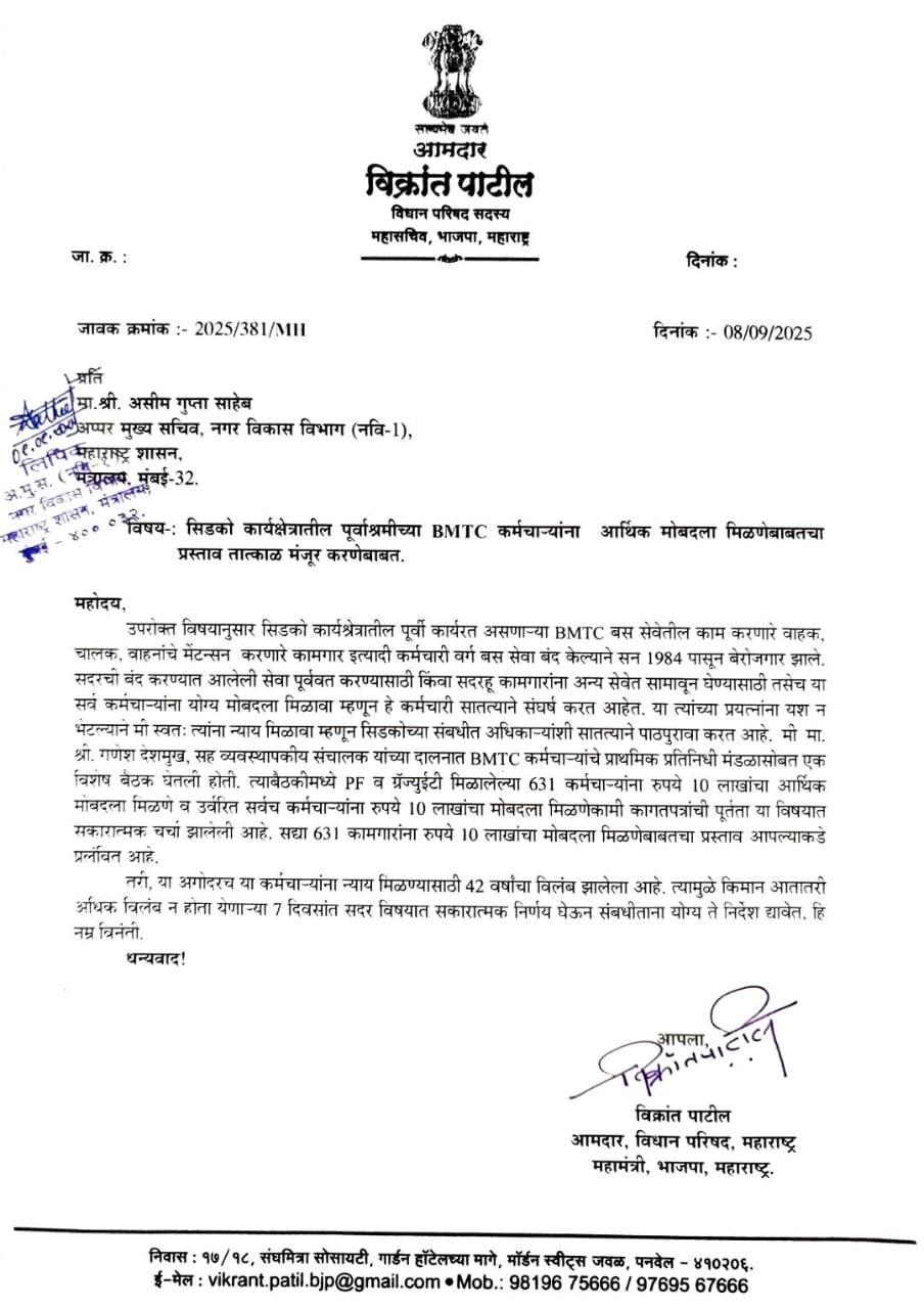 सिडको कार्यक्षेत्रातील पूर्वाश्रमीच्या BMTC कर्मचारी हे १९८४ पासून बससेवा बंद झाल्याने निराधार झाले होते. त्यांना योग्य आर्थिक मोबदला मिळावा म्हणून कर्मचारी व विविध संघटना अनेक वर्ष पाठपुरावा करत होते. परंतु तरीही ४२ वर्ष हा प्रश्न प्रलंबित होता.