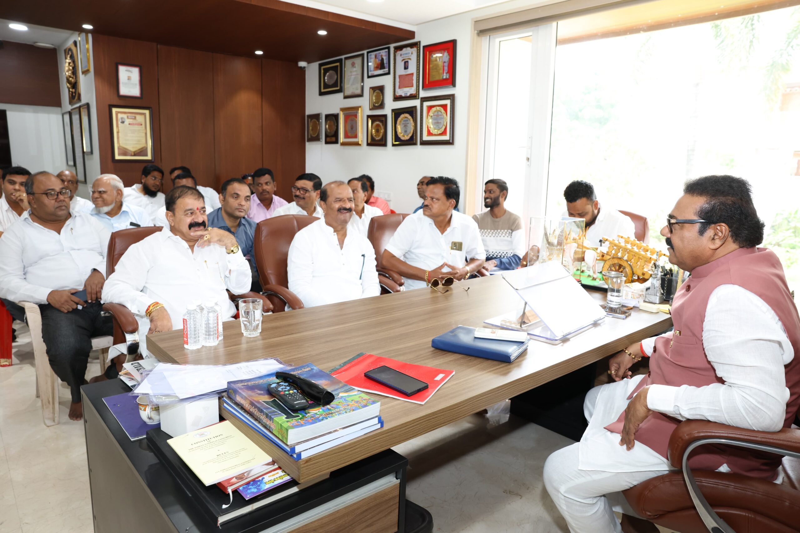 उलवे, ता. १७ : ‘सुखकर्ता’ येथील कार्यालयात जिल्हाध्यक्ष महेंद्रशेठ घरत यांच्या मार्गदर्शनाखाली नुकत्याच नियुक्ती झालेल्या विधानसभा प्रभारी यांची बैठक बुधवारी झाली. या बैठकीला कर्जत, उरण, पेण,महाड, खोपोली, माणगांव अलिबाग येथील पदाधिकारी उपस्थित होते. महाराष्ट्र प्रदेश सरचिटणीस मिलिंद पाडगावकर यांनी नवनियुक्त विधानसभा प्रभारी यांनी आगामी काळात जिल्हाध्यक्ष महेंद्रशेठ घरत यांच्याशी विचारविनिमय करून काॅंग्रेस पक्षाची विचारधारा तळागळापर्यंत पोहोचवण्यासाठी खंबीर भूमिका घ्यावी असे सांगितले. यावेळी जिल्हाध्यक्ष महेंद्रशेठ घरत म्हणाले, “सर्वांना सोबत घेऊन काॅंग्रेस बळकट करण्यासाठी हातात हात घालून काम करायचे आहे. आगामी काळातील स्थानिक स्वराज्य संस्थांच्या निवडणुकीसाठी तालुकाध्यक्ष आणि कार्यकर्त्यांनी कामाला लागावे. मी खंबीरपणे आपणा सर्वांच्या पाठीशी उभा आहे. नव्याने नियुक्ती झालेल्या सर्व प्रभारीना सहकार्य करायचे आहे.”