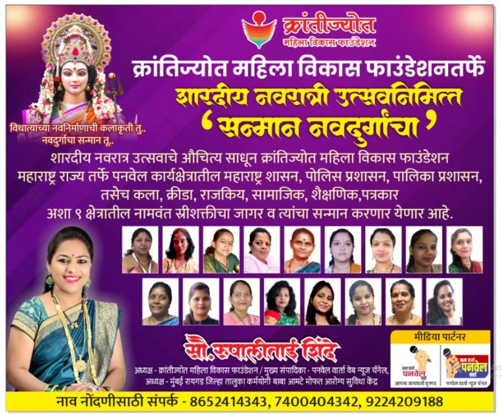 शारदीय नवरात्र उत्सवाचे औचित्य साधून क्रांतिज्योत महिला विकास फाउंडेशन महाराष्ट्र राज्यतर्फे पनवेल कार्यक्षेत्रातील ९ दुर्गाचा महासन्मान व स्त्री शक्तीचा जागर करण्यात येत आहे.
