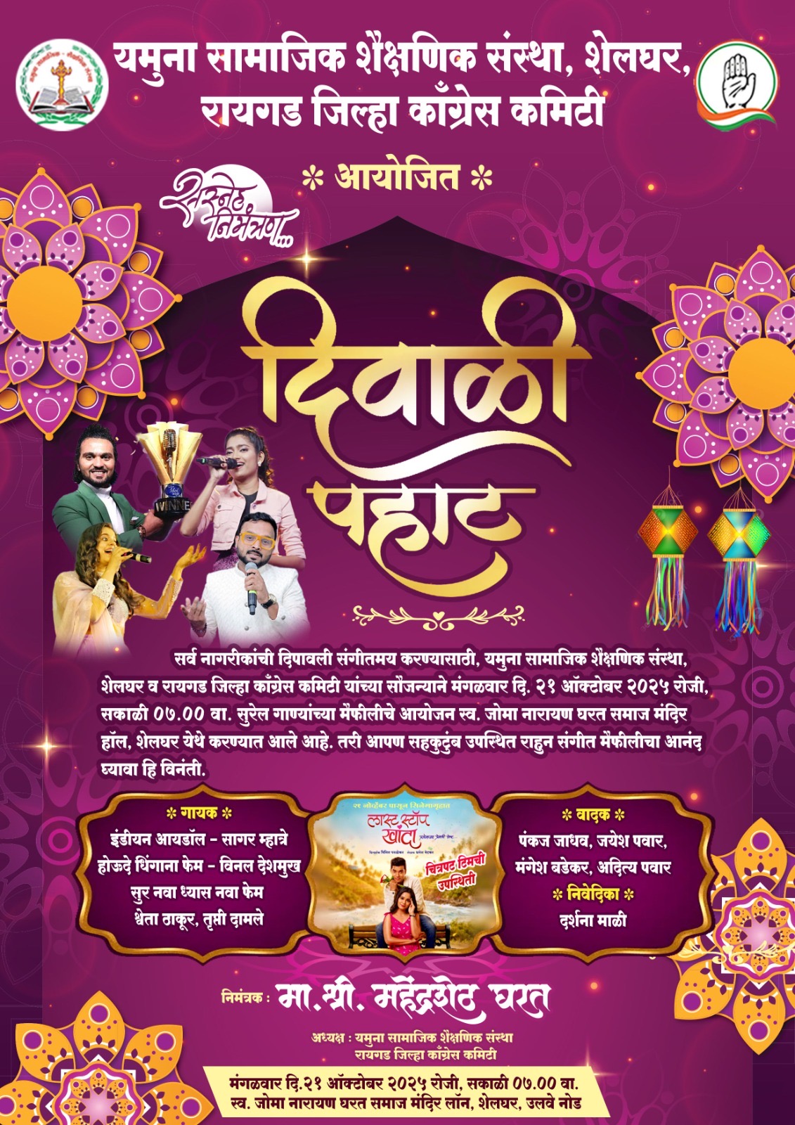 इंडियन आयडाल’ सागर म्हात्रे, `होऊ दे धिंगाणा फेम’ विनल देशमुख, `सूर नवा ध्यास नवा फेम’ श्वेता म्हात्रे, तृप्ती दामले यांच्या बहारदार गायनाने `दिवाळी पहाट’ रंगणार आहे. विशेष म्हणजे `लास्ट स्टॉप खांदा’ या चित्रपटाची टीमही यावेळी उपस्थित राहणार आहे.