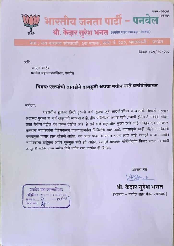 पनवेल शहरातील रस्त्यांवर गतिरोधक बसविण्याबाबत भाजपचे शहर उपाध्यक्ष केदार भगत यांची पालिकेकडे मागणी