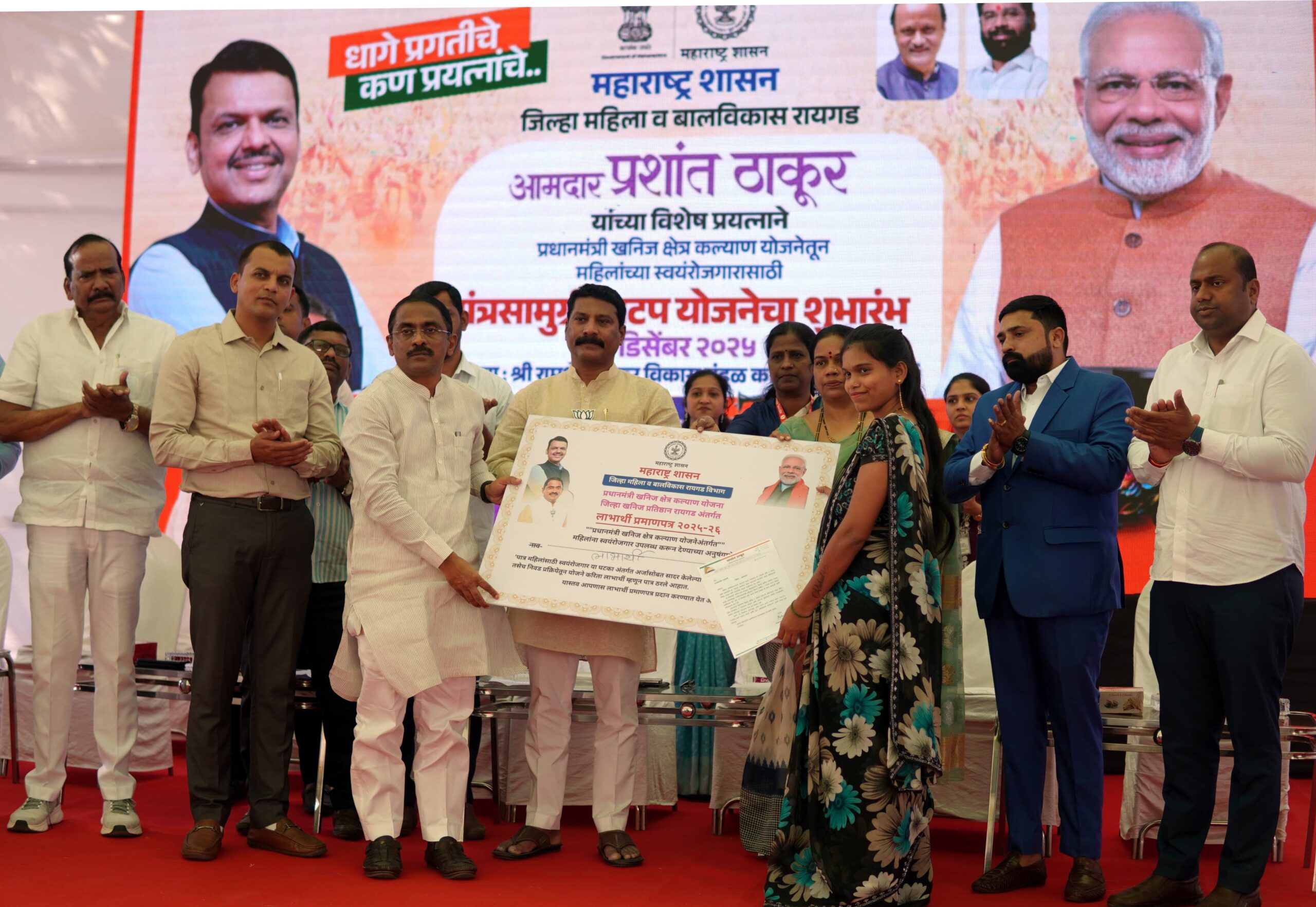पनवेल विधानसभा मतदारसंघातील महिलांना स्वयंरोजगाराच्या माध्यमातून आर्थिकदृष्ट्या सक्षम बनवण्याच्या उद्देशाने आमदार प्रशांत ठाकूर यांच्या संकल्पनेनुसार आणि प्रयत्नातून प्रधानमंत्री खनिज क्षेत्र कल्याण योजनेंतर्गत जिल्हा खनिज प्रतिष्ठान अंतर्गत घरघंटी व शिलाई मशीन वाटपाचा उपक्रम राबविण्यात आला असून या योजनेअंतर्गत निवड झालेल्या ४ हजार २५० पात्र लाभार्थींना आजपासून शिलाई व घरघंटी मशीनचे वाटप योजनेचा शुभारंभ झाला. त्यावेळी आपल्या भाषणातून सर्व बहिणीशी संवाद साधताना बोलत होते. या कार्यक्रमाला प्रमुख पाहुणे म्हणून भाजपचे उत्तर रायगड जिल्हाध्यक्ष अविनाश कोळी, राज्य परिषद सदस्य अरुणशेठ भगत, जिल्हा खनिकर्म अधिकारी अमर देवेकर, जिल्हा महिला व बाल विकास अधिकारी सुनिता ओव्हळ, महिला मोर्चाच्या जिल्हाध्यक्षा प्रिया मुकादम, भाजपचे जिल्हा उपाध्यक्ष प्रल्हाद केणी, माजी जिल्हा परिषद सदस्य राजेंद्र पाटील, अमित जाधव, पूर्व मंडल अध्यक्ष भूपेंद्र पाटील, युवा मोर्चाचे जिल्हाध्यक्ष आनंद ढवळे, संयोजक संतोष पवार, ऍड. चेतन जाधव आदी उपस्थित होते.