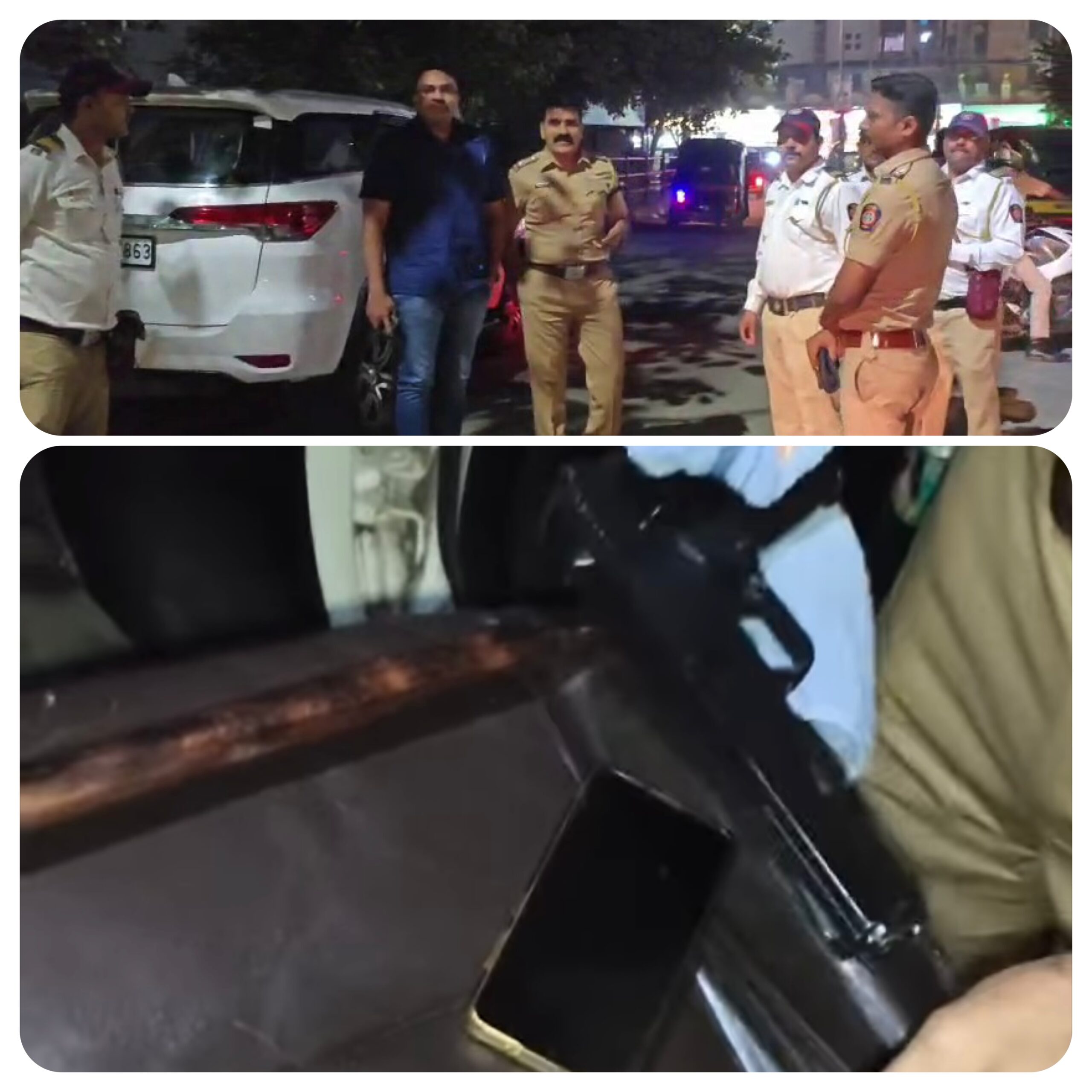 यानंतर पोलिसांनी वाहनाची तपासणी केली असता समोरील दरवाजा अर्धवट उघडा आढळला. आत तपासणी केल्यावर पिस्तूलसदृश शस्त्र आढळून आले. पुढील पाहणीत राजेंद्र निकम या नावाचे ड्रायव्हिंग लायसन्सही मिळाले. कोर्ट चेकर अॅपमध्ये तपासणी केली असता निकम यांच्या विरोधात मुंबई विभागात विविध गुन्हे नोंद असल्याचे समोर आले. यावेळी अधिक अंमलदारांना बोलावण्यात आले. मुंबई येथून काही वेळानंतर राजेंद्र निकम हे स्वतः घटनास्थळी आले. वाहनावर डुप्लिकेट नंबर प्लेटचा वापर, अनधिकृत पार्किंग आणि वाहनातून शस्त्रसदृश वस्तू मिळाल्यामुळे त्यांना ताब्यात घेऊन पुढील कारवाईसाठी खांदेश्वर पोलीस स्टेशनच्या डिटेक्शन टीमकडे सोपविण्यात आले.