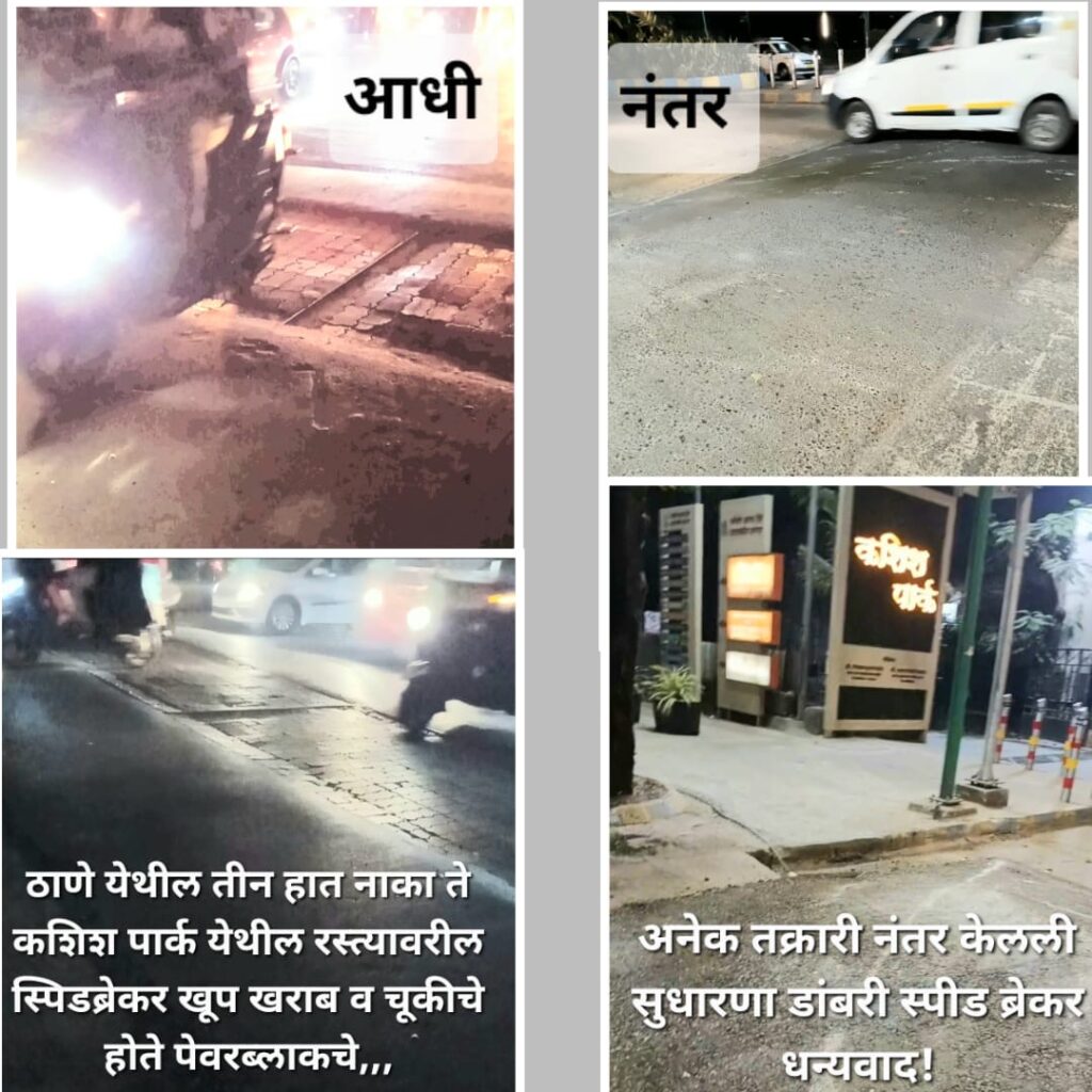 गेल्या अनेक दिवसापासून ठाणे तिनहात नाका ते कशिश पार्क मुंबई मुलुंड पच्छिम चेक नाका कडे जाणारा हायवे व आग्रारोड जोड रस्त्यावर असलेले पेवर ब्लॉकचे स्पिड ब्रेकर खूप खराब व चुकीचे होते अपघाताला निमंत्रण व वाहनासही धोकादायक स्थितीत होते. नेहमीच विनाकारण वाहतुक खोळंबा व पाणी साचत होते तसेच प्रदृषण होत असे कारण स्पिड ब्रेकर वर खाली व खड्डेमय झालेले होते. साहजिकच वाहने दिम्यागतीने जात असत. अनेक सामाजिक कार्यकर्ता व श्री सतिश पाटील (मुंबई पत्रकार) यांना हा मुद्दा मार्गी लावून धरला होता. अखेर ठाणे महानगर पालिकेने उशीरा का होईना दखल घेऊन आता जुने धोकादायक स्पिडब्रेकर काढून त्या ठिकाणी नवीन डांबरी स्पिडब्रेकर बसवून वाहन चालकांना व जनतेला सुसाह्य सहकार्य केले.