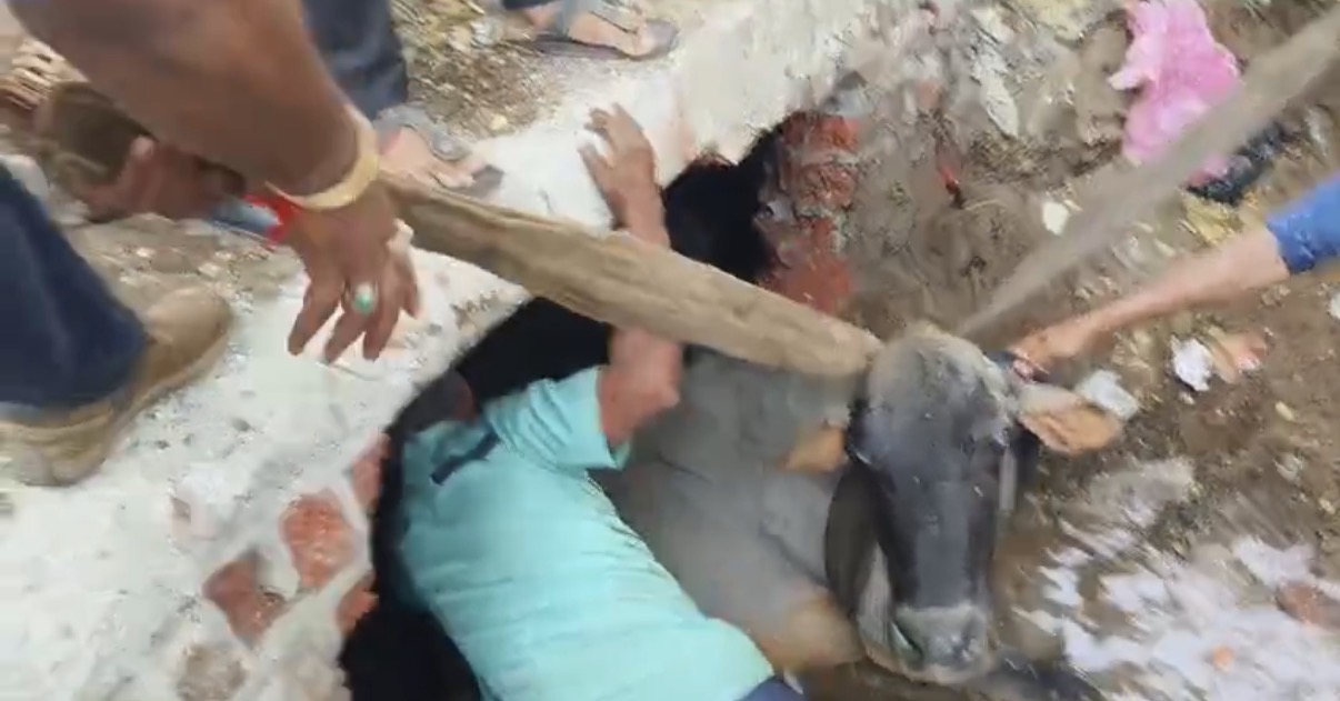 धोकादायक ड्रेनेज टँकमधून गाभण गायीची सुखरूप सुटका