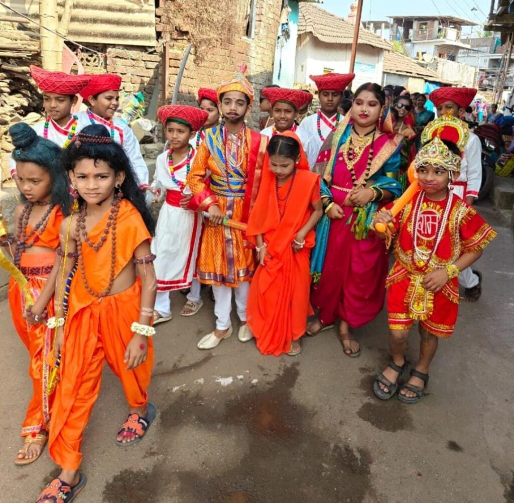 देवदेवतांच्या प्रतिमूर्ती श्रीगणेश , श्री राम लक्ष्मण माता सीता हनुमान महाराष्ट्राचे आराध्य दैवत छत्रपती शिवाजी महाराज त्यांचे मावळे व विविध सांस्कृतिक परंपरा दर्शवणारी वेशभूषा ही ढोलांच्या तालवार ताशाच्या गजरात छत्रपती शिवाजी महाराज की जय अशा घोषणाच्या गजरात गावात काढण्यात आली तसेच समाज प्रबोधन पर संदेश म्हणून सांस्कृतिक परंपरा बऱ्याचशा विद्यार्थिनींनी स्व संरक्षण काठी प्रात्यक्षिक केले व नववर्षाच्या स्वागतपर लेझीम तालावर पद दालित्य नृत्य अशा विविध सांस्कृतिक परंपरांचा अंतर्भाव असलेले नृत्य व प्रात्यक्षिके केले व हा सोहळा मोठया दिमाखात न भूतो भविष्यती अशी विजयाची शोभायात्रा ही विद्यार्थ्यांनी सक्रीय सहभाग घेऊन साजरी केली.